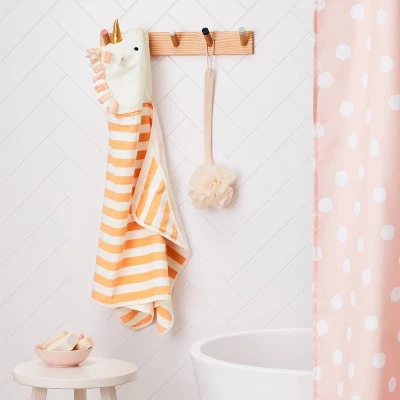 Bring a dash of magic to their bath time with the Unicorn Hooded Towel from Pillowfort™. Boasting a 100% velour cotton construction, this baby hooded bath towel easily drapes around them and feels soft against their skin. Plus, the attached hood ensures they stay toasty after a bath and until you get them dressed. Featuring a white and orange striped pattern, it also has unicorn face detailing with a golden horn accent, and fabric hair and ear detailing on the hood to fill their bath routine with fun flair. Designed with a loop behind the hood for easy hanging, you can simply toss it in the washing machine for added convenience.