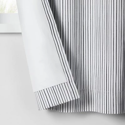 Help encourage your kiddo to sleep better with the Blackout Irregular Mini Stripe Panel from Pillowfort™. This lined blackout curtain panel not only helps block morning sunshine or bright afternoon light from entering their room and waking them up, but it also helps block outside noise to let them enjoy their sleep or nap. Plus, this curtain panel helps prevent harmful UV rays from filtering through the window. Designed with hidden loops at the back that slip over the curtain to create soft pleats, it features a rod pocket that allows for easy hanging. Adorned with thin vertical stripes in navy and brown hues on a light blue background, it’s sure to add functional style to their room.