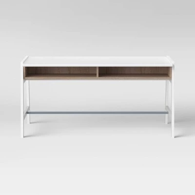 They’ll love reading books, drawing pictures and enjoying a variety of other activities at this cute and convenient Bly Kids’ Activity Table from Pillowfort™. Designed with a long, rectangular tabletop and trestle base, this kids’ desk is perfect for creating a designated area for them to do homework or get creative with arts and crafts. The white finish on the wood veneer coordinates easily with a wide variety of room decor, while the sides and two built-in open storage cubbies boast a contrasting accent color with their natural wood finish. Style it solo with a lamp and chair, or coordinate with other pieces from the Pillowfort Bly Kids’ Collection for a tidy matching look.
