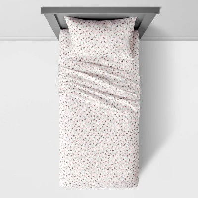 The Cherry Microfiber Sheet Set from Pillowfort™ adds eye-catching style to your kiddo’s room. This kids sheet set includes one full elastic fitted sheet, one flat sheet and matching pillowcase(s), each featuring allover cherry prints on a white background to transform their room into an orchard. Boasting a microfiber construction and brushed for softness, this printed bedding set feels soft against their skin and helps them stay comfy in bed as they read a book or catch some z’s. Pair these pieces together for a cohesive look or mix and match with other sheets, comforters or pillows to bring a fun update to their room.