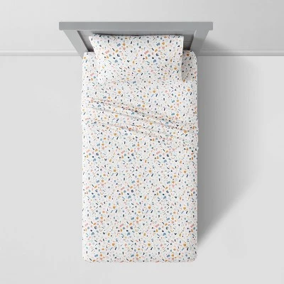 Bring a playful look to your child’s bed with this Shapes Cotton Sheet Set from Pillowfort™. This coordinated sheet set includes one fitted sheet, one flat sheet and one pillowcase, each made from 100% cotton percale material to provide complete comfort in bed. It showcases a colorful print of different shapes against a white backdrop to lend fun flair to their room decor. Perfect for everyday use, this bedding set can be machine washed for easy care.