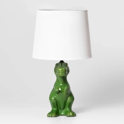 Bring fun prehistoric figurines to their bedroom lighting with this Dinosaur Table Lamp from Pillowfort™. This ceramic table lamp makes a practical lighting accent. It showcases a sculpted dinosaur-shaped base in a bright green color for a fun themed look. The white drum shade lends a touch of crisp modern style, while the one-way push through switch makes operating the lamp a breeze. Just place it on their bedside, study desk or dresser to illuminate their space.