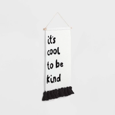 Spread positivity in any space with this It’s Cool to Be Kind Hanging Knit Banner from Pillowfort™. This white hanging banner features the quote “It’s Cool to Be Kind” knitted in black to pop against the background. Whether you hang this quote knitted banner in your living room or any other area, you’ll love the elegant look added by it to your space.