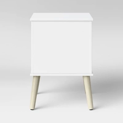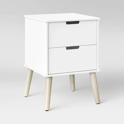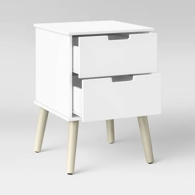 Help organize their room and bring a quick refresh to it with the Modern Nightstand from Pillowfort™. This wooden nightstand features two drawers to tuck away anything from their comic books, small electronics, important papers and other small trinkets or treasures and personal items, while the top can be used to display an alarm clock, a framed family photograph, a succulent or any other decorative item to catch their fancy. Featuring a sleek square silhouette and a white frame, and set on four angled wooden legs, this wooden nightstand brings modern flair to their room decor.