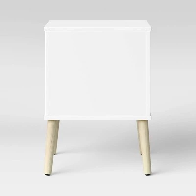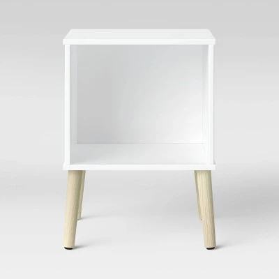 Even small rooms can get an instant upgrade with the convenience of this simple yet stylish Modern Open Nightstand from Pillowfortâ„¢. Featuring a square shape with an open front and four legs, this white and natural wood nightstand is perfect for placing next to their bed with a lamp on top and their favorite bedtime stories or stuffed animals inside. The open design lets you display decorative items while also providing easy access to contents. Plus, the clean lines, slender legs and white color palette coordinate easily with a wide variety of bedroom decor.