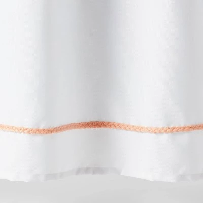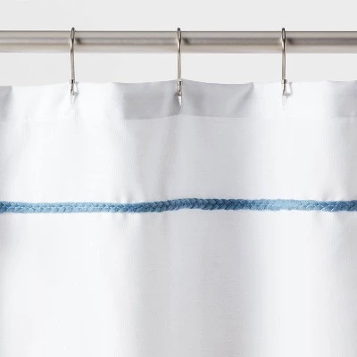 Give your bath space some artistic flair with this Multi-Striped with Tassels Shower Curtain from Pillowfort™. The twill shower curtain is adorned with embroidered, tassel-tipped horizontal stripes popping from the crisp white backdrop in multicolors to beautifully enclose a bathtub or shower stall for added privacy with a timeless vibe. Made from a recycled polyester-cotton blend, the decorative shower curtain features a buttonhole top for easy installation, and is machine washable for a quick refresh whenever needed.