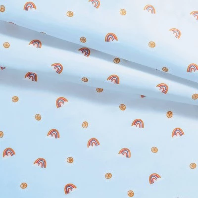 Fill your kiddo’s room with happy colors and fun patterns with the Rainbow Microfiber Sheet Set from Pillowfort™. Made of a brushed, lightweight microfiber fabric, this printed bedsheet set is decked out in a colorful print of rainbows, clouds and suns against a light-blue backdrop that brings a dash of cheerful flair to their room. Perfect for year-round use, this rainbow-printed sheet set comes with a fitted sheet, flat sheet and matching pillowcase(s) for a complete look. The fully elastic fitted sheet is suitable for mattresses up to 16 inches deep to ensure a snug, secure fit and create a smooth, soft surface for your child to lie on. Machine-washable for easy care and cleaning, this light-blue bedding set is perfect for everyday use — add a solid or printed coverlet or comforter, and complete the look with vibrant rainbow- and sun-shaped stuffed pillow buddies.