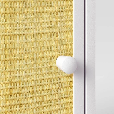 Add space-saving storage to your kid’s room with this Rattan and Wood Bedside Table from Pillowfort™. Standing on four tapered legs, this white bedside table features a wooden construction with rattan weave on the door of the drawer for added natural charm and textured appeal. The tabletop comes with a raised design on three sides and open on one side, making it easy to style a table lamp and place accessories. Designed in a square shape, this rattan and wood bedside table easily fits nexts to a bed and provides ample space for their books and other items with the built-in drawer.