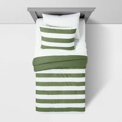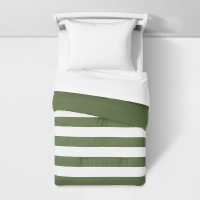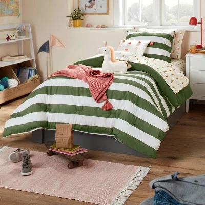 Instantly brighten their room decor with the Rugby Stripe Comforter Set from Pillowfort™. This bedding set includes a cozy comforter and matching pillow sham(s) for coordinated flair. Each piece features rugby stripes for a simple and clean look that’s sure to blend in with a variety of decor styles. The 100% cotton shell ensures soft, comfortable year-round use, while the cozy comforter with fill adds a layer of warmth to the top of their bed. Add solid sheets and other bedding pieces to complete their bedding ensemble, and machine wash for easy care.