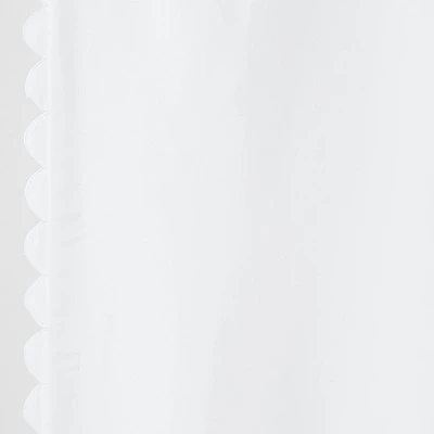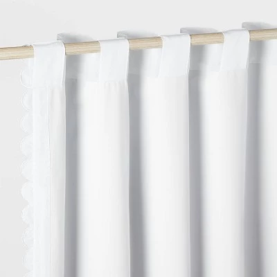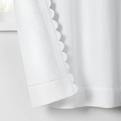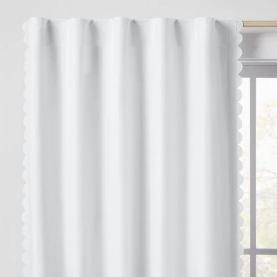 Help limit unwanted light and outside noise in your child’s bedroom with this Scallop Blackout Curtain Panel from Pillowfort™. This blackout curtain panel brings decorative and functional style to their space. It’s detailed with scalloped accents on the edges for a playful and pretty pop of texture. The lined construction helps block sunlight from entering the room, helping provide your child a more peaceful sleeping environment. Plus, it also adds privacy to the window and helps in noise reduction. The classic rod pocket design along with a button back tab allows for easy and secure installation. Just fit in a standard rod to complete their window decor.