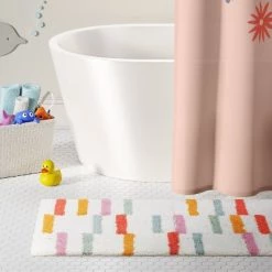 Add a sweet finish to your family’s bathroom decor with this Striped Bath Rug from Pillowfort™. This rectangular bath rug is made from 100% cotton and it features a textured construction that feels soft underfoot. Adorned with multicolor stripes in green, yellow, red and violet hues on a white background, this low-pile bath rug brings a pop of color to any bath space.