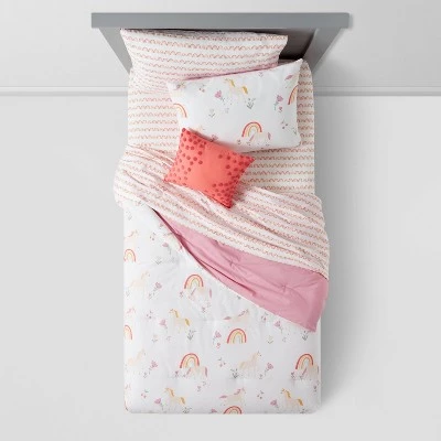 Enhance the look and feel of your kiddo’s room with this Unicorn Bedding Set with Sheets from Pillowfort™. This bedding set includes one twin comforter and a matching sham, both featuring a colorful print of unicorns, rainbows, flowers and fruit on a white background, and a decorative red pillow with pompoms. In addition, this decorative bedding set comes with a fitted sheet, a flat sheet and a matching pillowcase showcasing scallop-print rows in a vibrant rainbow-color palette on a white background for a magical look. Each piece in this set is made from 100% cotton that feels soft to the touch, while the comforter, sham and pillow feature a soft fill for sleeping or reclining comfort. Use these bedding pieces together, or mix and match them with other bedding sets to create a cheerful look in their bedroom.