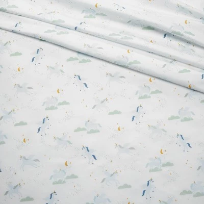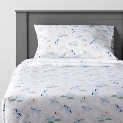 Add some magic to their sleep time with the Unicorn Microfiber Sheet Set from Pillowfort™. This kids sheet set includes one fitted sheet, one flat sheet and matching pillowcase(s), each adorned with allover prints of a unicorn with a colorful mane and an orange horn, along with cloud prints to bring sweet style to their room. Boasting a microfiber construction that’s brushed for softness, this printed bedding set feels soft against their skin and ensures they’re comfy in bed as they read a book or catch some z’s. Pair these pieces together for a cohesive look or mix and match with other sheets, comforters or pillows to bring a fun update to their room.