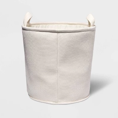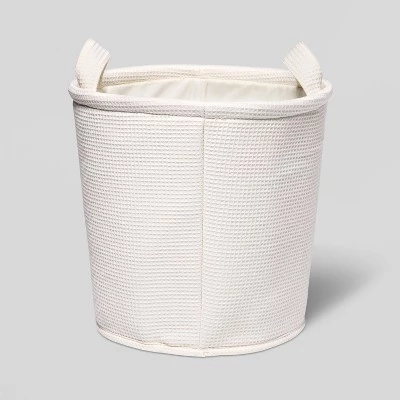 Decorate and organize your kid’s space in textured style with this Waffle Storage Basket from Pillowfort™. Its round design showcases a cream exterior and interior for a coordinating look that suits their decor. Perfect to fit in a shelf or to place on the floor with the flat bottom, this cream storage basket with handles provides ample space for their toys, accessories and other items to help keep their room neat and tidy.